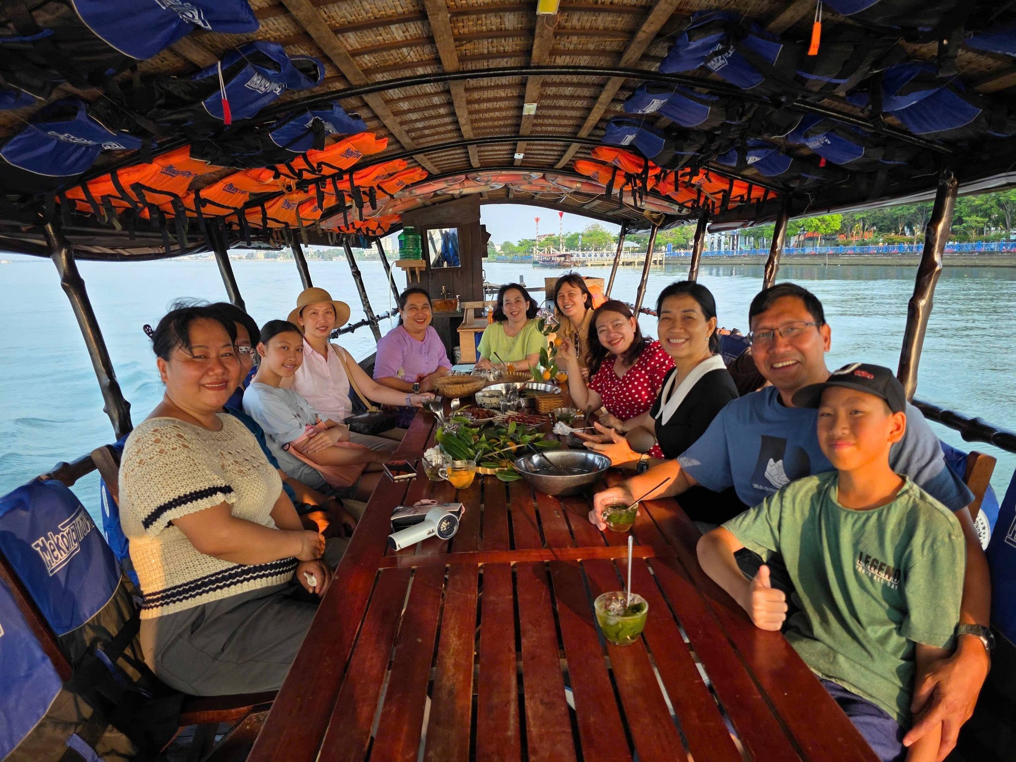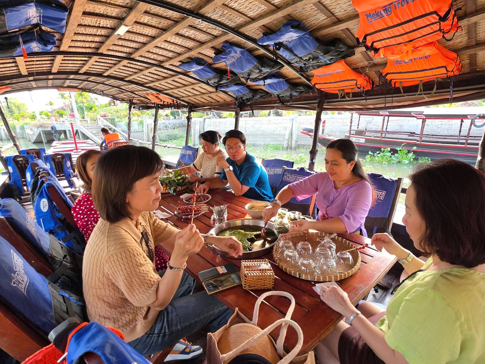 Around 4 PM, the group boarded the boat, leaving Ut Trinh homestay for a relaxing cruise on a Mekong Travel tourist boat. Visitors will enjoy a variety of sweets, jams, and refreshing drinks: grass jelly, iced green tea, homemade shaved ice syrup (no artificial colors), rambutan jam, gooseberry jam ...