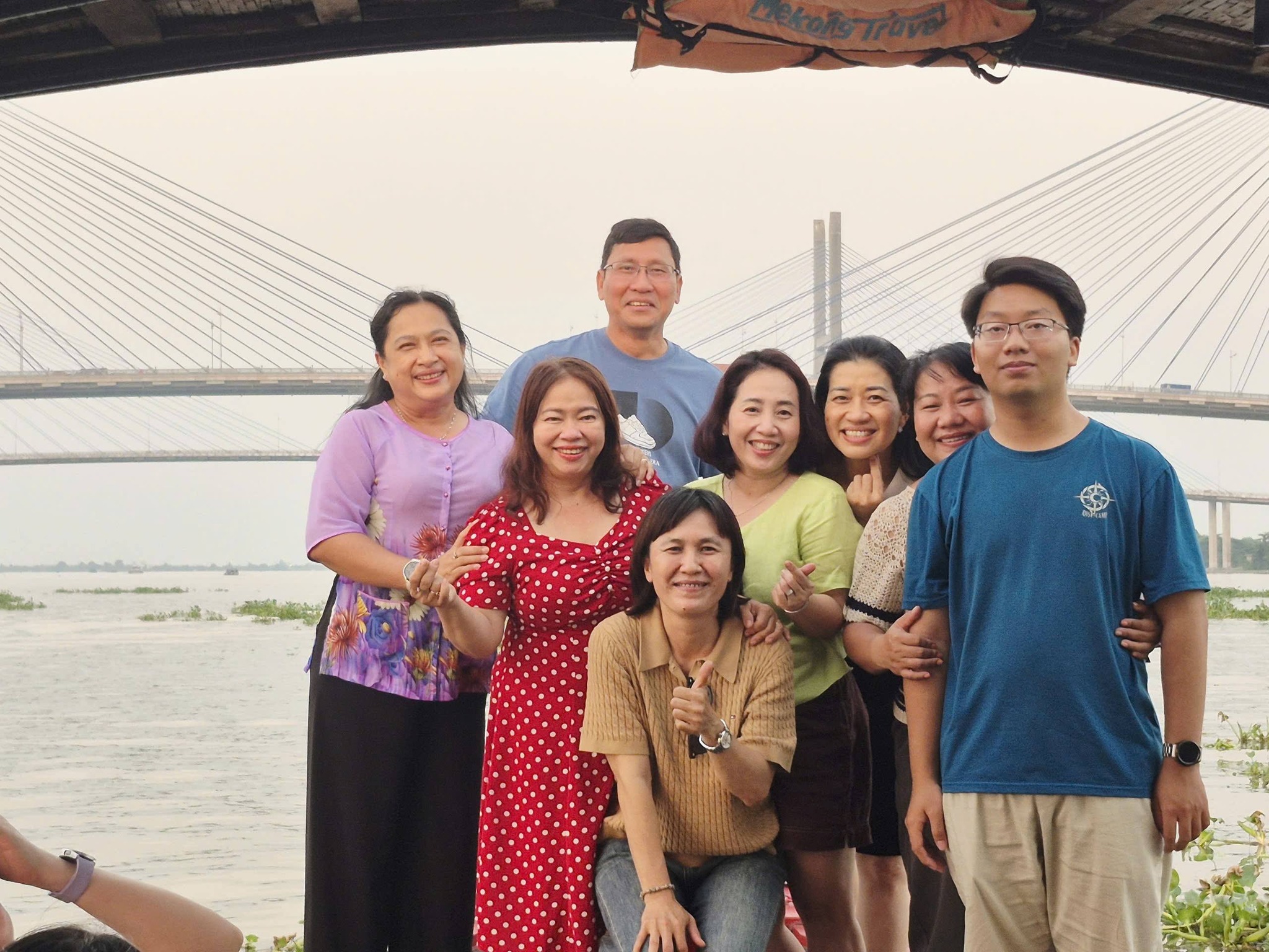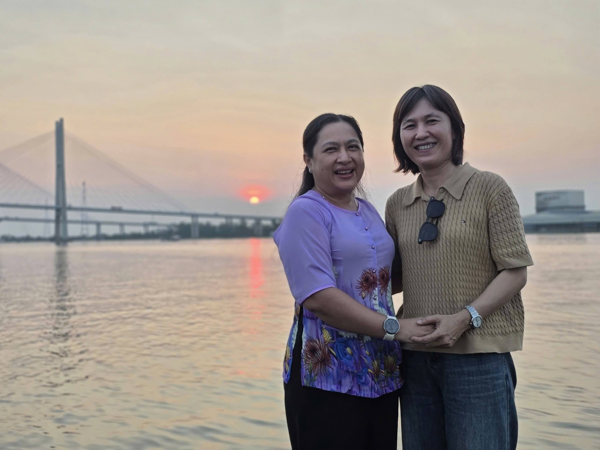 The sun gradually sets over the tranquil Co Chien River between the My Thuan 1 & 2 bridges, as I watch the orange sun slowly disappear into the horizon with my loved ones.